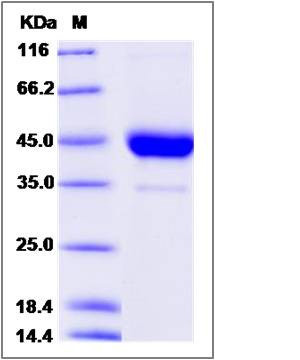 | Molecular Weight | The recombinant cynomolgus CD53 is a disulfide-linked homodimer. The reduced monomer comprises 311 amino acids and has a calculated molecular mass of 34.9 KDa. The apparent molecular mass of it is approximately 44 KDa respectively in SDS-PAGE. |