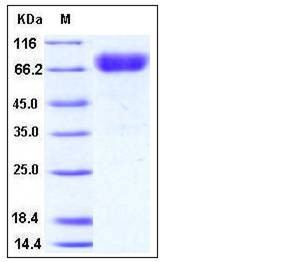 | Molecular Weight | The recombinant mouse HAVCR1/Fc is a disulfide-linked homodimer. The reduced monomer comprises 438 amino acids and predicts a molecular mass of 49 kDa. As a result of glycosylation, the apparent molecular mass of HAVCR1/Fc monomer is approximately 80-85 kDa in SDS-PAGE under reducing conditions. |