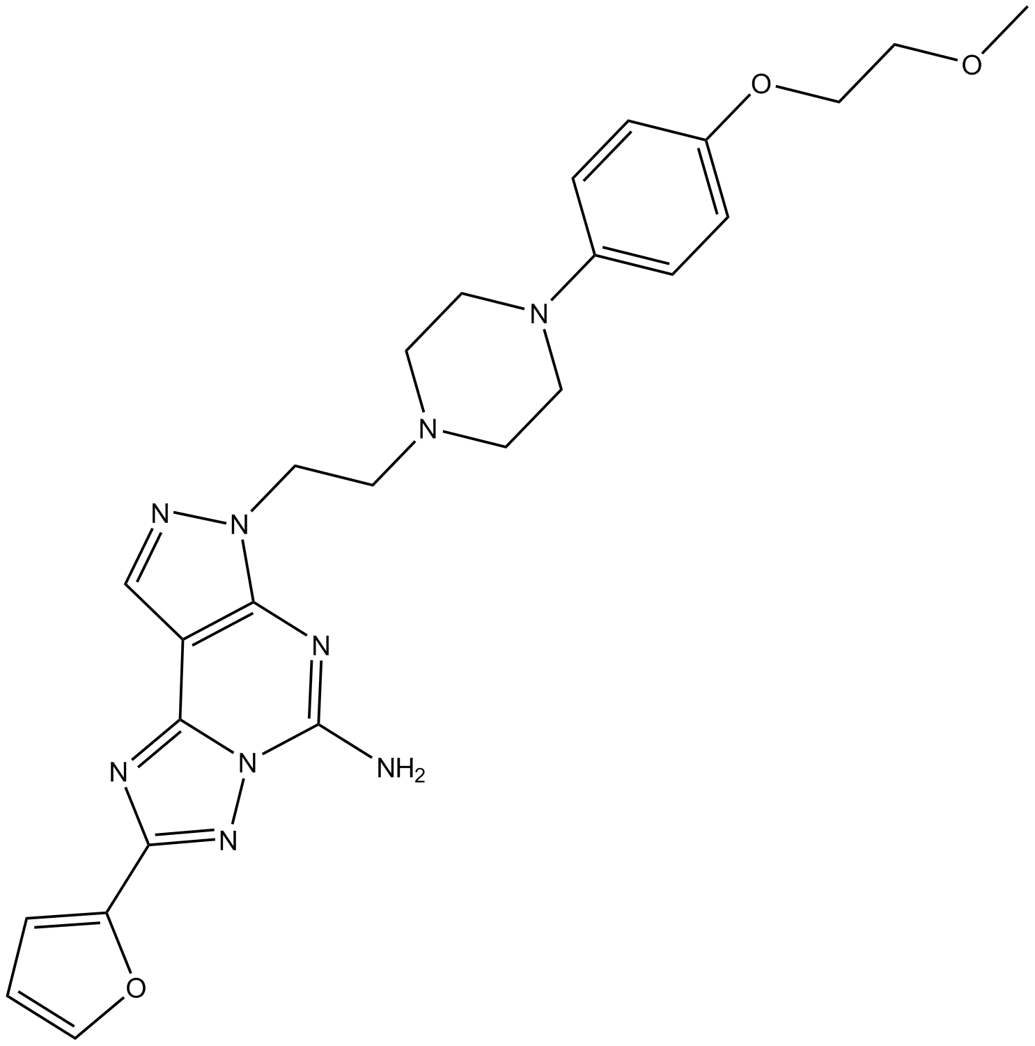 Chemical Name: 2-(furan-2-yl)-7-(2-(4-(4-(2-methoxyethoxy)phenyl)piperazin-1-yl)ethyl)-7H-pyrazolo[4,3-e][1,2,4]triazolo[1,5-c]pyrimidin-5-amine