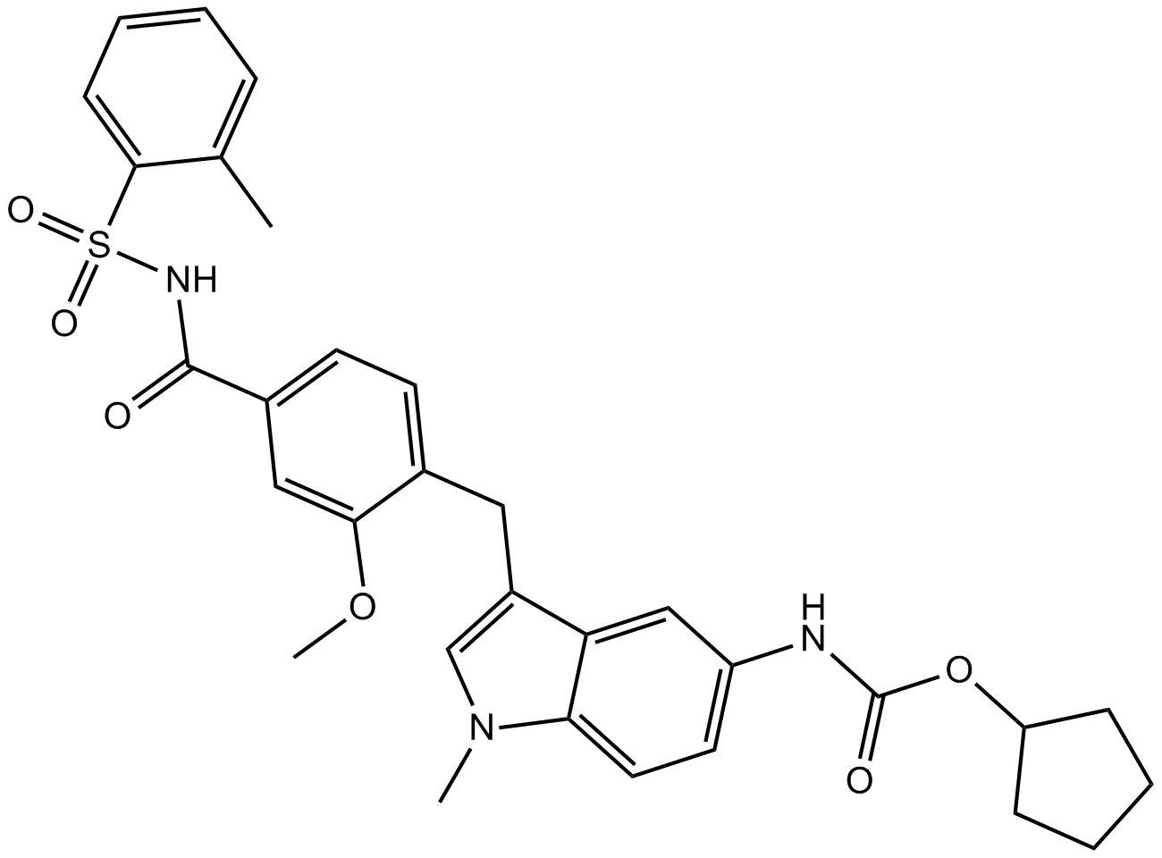 Chemical Name: cyclopentyl N-[3-[[2-methoxy-4-[(2-methylphenyl)sulfonylcarbamoyl]phenyl]methyl]-1-methylindol-5-yl]carbamate